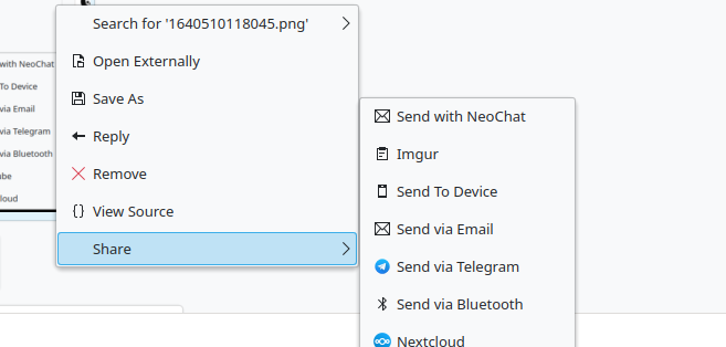 NeoChat 22.02 is out with the possibility of sharing files directly from NeoChat to other apps and services (Nextcloud, Imgur, email, ...). We also added support for minimizing the application to the system tray on startup and you can now label accounts to better organize them if you are using the multi-account feature. Aside from that, we spend some time fixing many small bugs and paper cuts reducing the total amount of open bug reports by 20%.