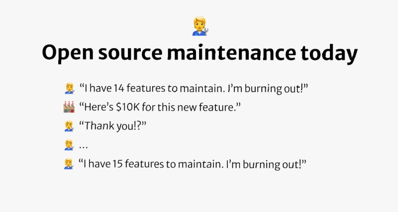 This funding should NOT be tied to specific feature development, but simply funding the core maintenance of the infrastructure - paying for the maintainers (and/or letting them or their umbrella org hire trusted ones!) to ensure the core project remains healthy and secure. Otherwise, the pressure just rises on the core project to chase feature development at the expense of maintenance (making maintenance harder) - or, worse, to be pushed away from open source into building proprietary solutions or crippling the open source by moving valuable features into side proprietary products.