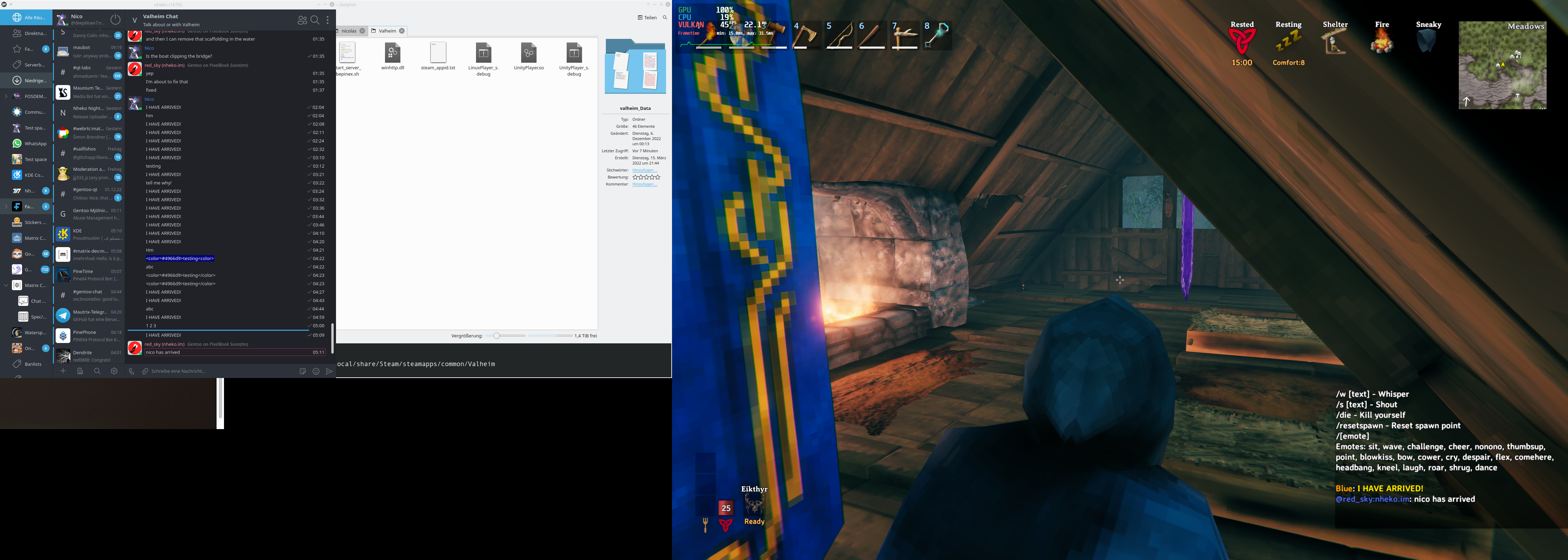 The bridge now avoids double bridging even with multiple users running the bridge client side. It also prevents historical messages from showing up in Valheim, so that starting the game is less confusing. Last but not least, red_sky (nheko.im) ported the user color algorithm from Nheko, so the colors should now look more familiar instead of being a generic blue.